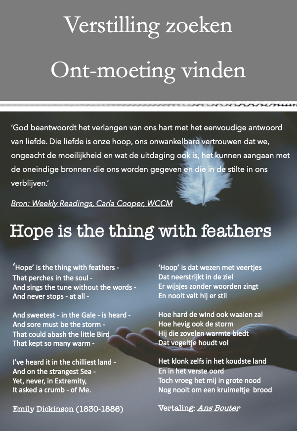 ‘Hope’ is the thing with feathers. On 29 december 202130 december 2021 door Martien van BergeninBericht Bron: Weekly Readings, Carla Cooper, WCCMVertaling gedicht: Ans BouterAfbeelding: Photo by Javardh on Unsplash hope-is-a-thing-with-feathersDownload ‘The thing with feathers’………klik hier of op de afbeelding om te beluisteren. Dit delen: Delen op X (Opent in een nieuw venster) X Share op Facebook (Opent in een nieuw venster) Facebook Meer Afdrukken (Opent in een nieuw venster) Print Email a link to a friend (Opent in een nieuw venster) E-mail Share on Pocket (Opent in een nieuw venster) Pocket