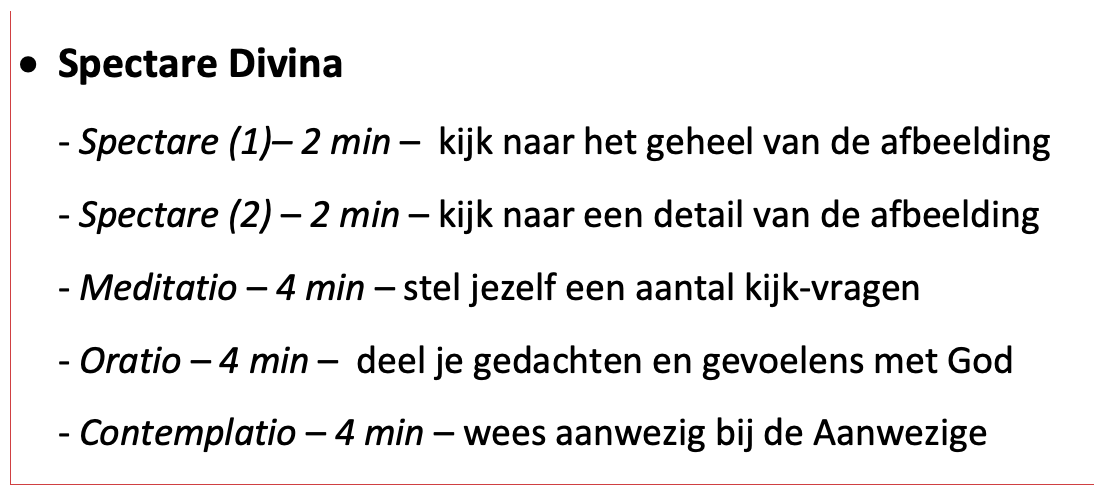 Nu is een Beeldmeditatie iets anders dan een kunstbeschouwing – noch het uitgebeelde (bijbel)verhaal, noch de visie van de kunstenaar staan centraal. Het gaat veeleer om de vraag wat het beeld in zijn geheel, of een bepaald detail in het beeld, nú bij je oproept – welke interactie je waarneemt, opmerkt tussen jou en het kunstwerk. In een aansluitende fase reflecteer je daarop en probeer je helder te krijgen of er en zo ja welk verband is tussen wat je opmerkte en je huidige dagelijkse leven en wat daarin speelt. Daarna kun je je gevoelens en gedachten delen met jouw God. Tenslotte verblijf je nog enkele minuten in stille (niet verbale) aanwezigheid bij het beeld.
