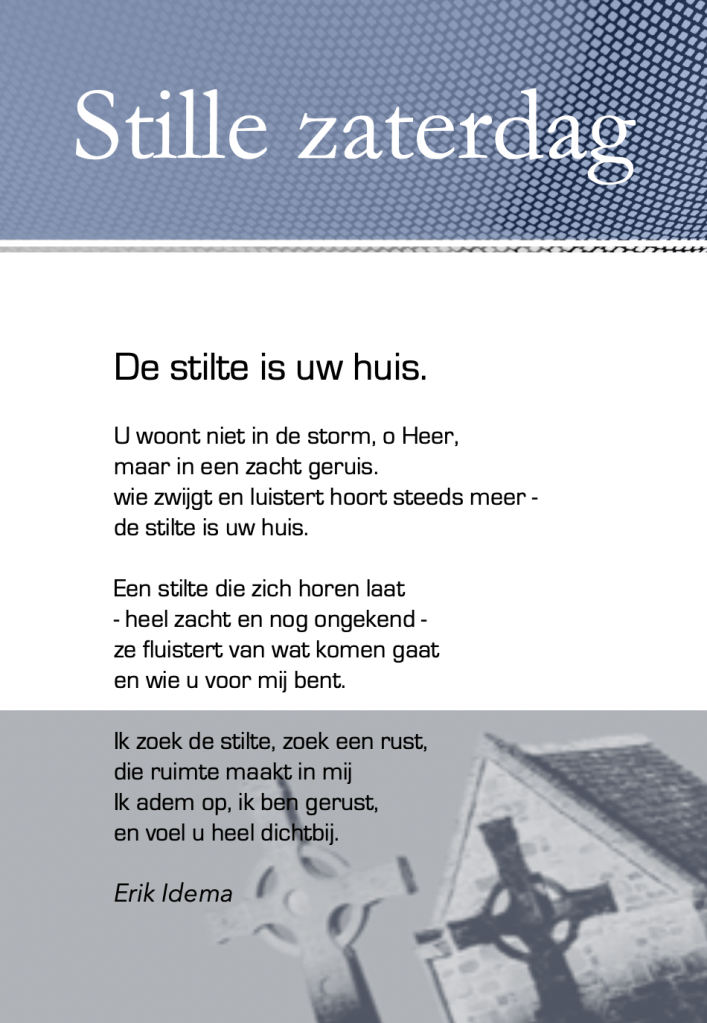 Stille zaterdag On 19 april 2025 door Martien van BergeninBericht Dit delen: Delen op X (Opent in een nieuw venster) X Share op Facebook (Opent in een nieuw venster) Facebook Meer Afdrukken (Opent in een nieuw venster) Print Email a link to a friend (Opent in een nieuw venster) E-mail Share on Pocket (Opent in een nieuw venster) Pocket