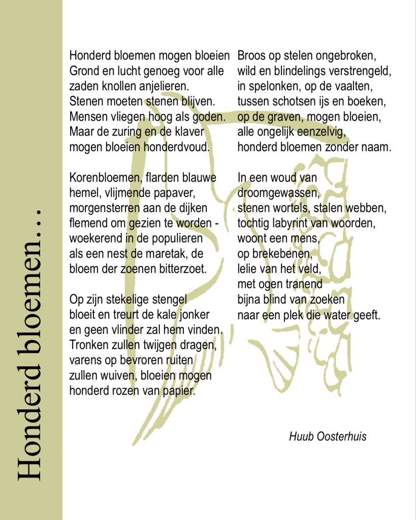 Het gedicht ‘Honderd bloemen’ van Huub Oosterhuis trof mij in deze Corona-tijd. De natuur barstte open in de lente, de bloemen op de velden (mij troffen vooral de velden en bermen met koolzaad en fluitenkruid) staan er ‘flemend om gezien te worden’ en de mens…….zat in quarantaine thuis, lag aan de beademing in het ziekenhuis of is stervenshard aan het werk om het hoofd boven water te houden….