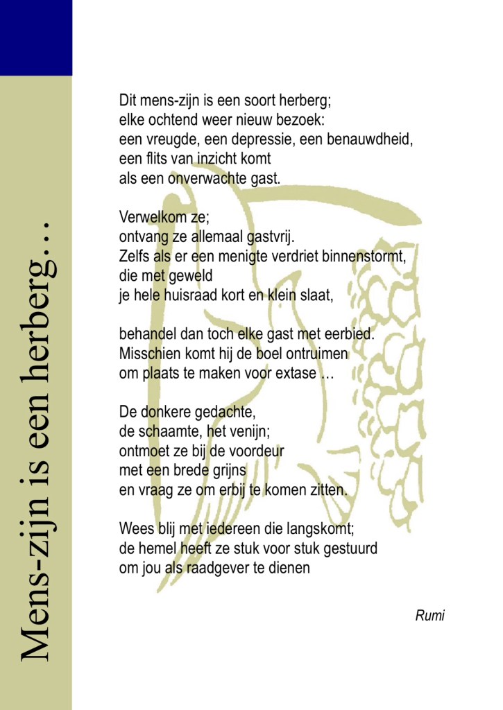 Daniël Lohues componeerde een lied met de strekking van het gedicht van Rumi. Hij zingt in dialect – Drenths. Je kunt het hier beluisteren op Spotify of hier op YouTube. En hier vind je de tekst in het Drents met de vertaling in ABN…..:)