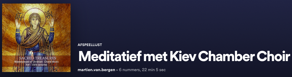 Thuisgekomen raadpleegde ik Spotify voor meer van dit moois. Ik stelde er een ‘Meditatief Ruim Kwartiertje’ (22 minuten) mee samen. Je vindt hem hieronder. Drie gezongen Oekraïense gebeden – aangevuld met twee maal de briljante compositie 4’33” van John Cage (bestaande uit twee maal 4 min en 33 seconden stilte) en afgesloten met een piano/cello muziekstuk met de betekenisvolle titel ‘Darkness Dawns’ (Duisternis Breekt Aan).